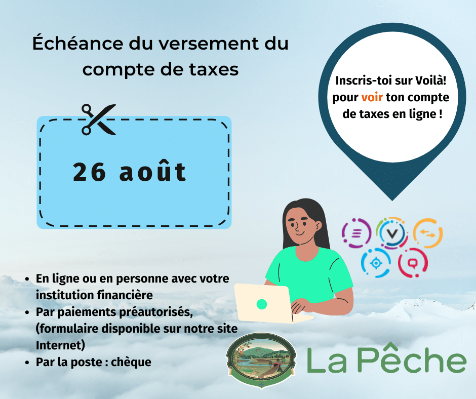 Il est possible de payer les factures de taxes municipales auprès de votre institution financière ou en personne, au bureau de la Municipalité.
