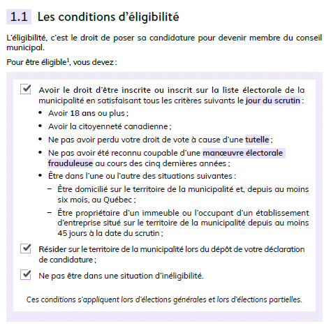 La première étape consiste à vous assurer que vous êtes éligible à poser votre candidature. Certaines conditions doivent être remplies. C’est ce qu’on appelle l’éligibilité. Comme candidate ou candidat, vous devez avoir le droit d’être inscrite ou inscrit sur la liste électorale de la municipalité, et résider sur le territoire de celle-ci. Nous vous invitons à consulter le tableau pour les Conditions d’éligibilité avant de présenter votre candidature aux élections municipales.