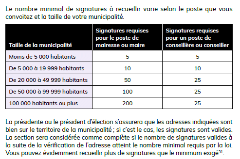 Bien que deux pages de signatures soient incluses dans votre formulaire de candidature, le nombre minimal requis varie selon le poste convoité et la taille de votre municipalité. Consultez le tableau de référence pour plus de détails.